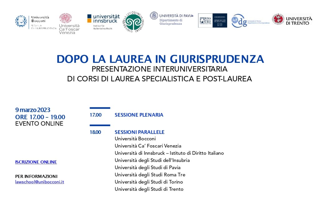 Anche quest’anno, parteciperemo all’iniziativa “Dopo la Laurea in Giurisprudenza. Presentazione interuniversitaria di corsi di laurea specialistica e post-laurea” promossa dall’Università Bocconi.