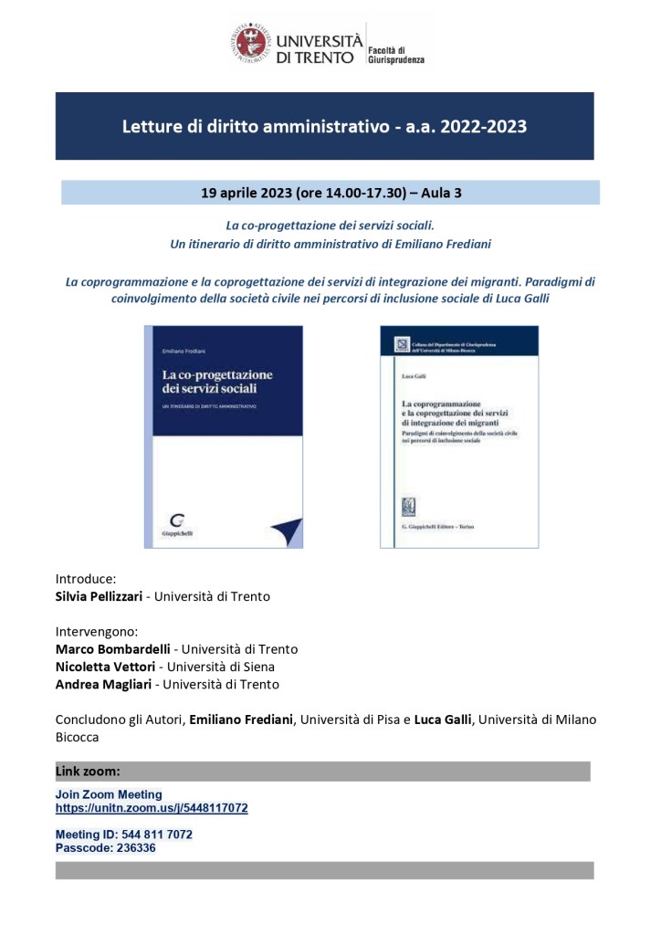 Nell’ambito del percorso Letture di diritto amministrativo – a.a. 2022-2023 rilanciamo con molto piacere la doppia presentazione di La co-progettazione dei servizi sociali. Un itinerario di diritto amministrativo di Emiliano Frediani e di La coprogrammazione e la coprogettazione dei servizi di integrazione dei migranti. Paradigmi di coinvolgimento della società civile nei percorsi di inclusione sociale di Luca Galli che si terrà mercoledì 19 aprile, dalle ore 14.00, presso l’Aula 3 della Facoltà di Giurisprudenza.