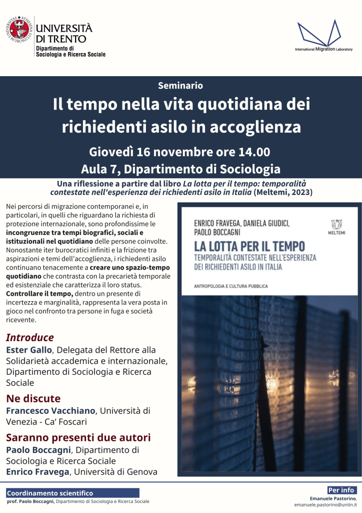 Nei percorsi di migrazione contemporanei e, in particolari, in quelli che riguardano la richiesta di protezione internazionale, sono profondissime le incongruenze tra tempi biografici, sociali e istituzionali nel quotidiano delle persone coinvolte. Nonostante iter burocratici infiniti e la frizione tra aspirazioni e temi dell’accoglienza, i richiedenti asilo continuano tenacemente a creare uno spazio-tempo quotidiano che contrasta con la precarietà temporale ed esistenziale che caratterizza il loro status. Controllare il tempo, dentro un presente di incertezza e marginalità, rappresenta la vera posta in gioco nel confronto tra persone in fuga e società ricevente.